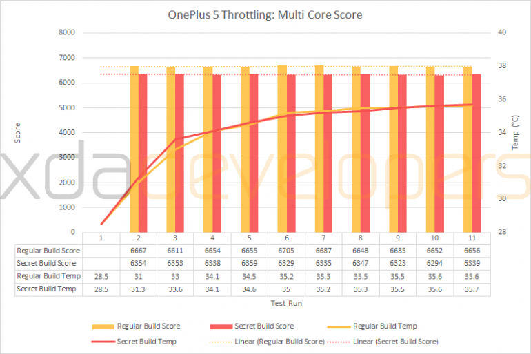 Соответственно, тестовый пакет GeekBench 4 продемонстрировал различные результаты для многоядерного теста. Так, версия GeekBench 4 из Play Store демонстрировала результат на уровне 6650-6700 баллов. В то же время как собственная сборка GeekBench 4, которая не определялась встроенным ПО смартфона в качестве тестового приложения, демонстрировала результат на уровне 6300-6350 баллов. Результат тоже вполне хороший, но всё же не столь высокий, как в специальном режиме работы. Но именно этот результат даёт более реальную оценку производительности смартфона OnePlus 5 при типичном использовании.