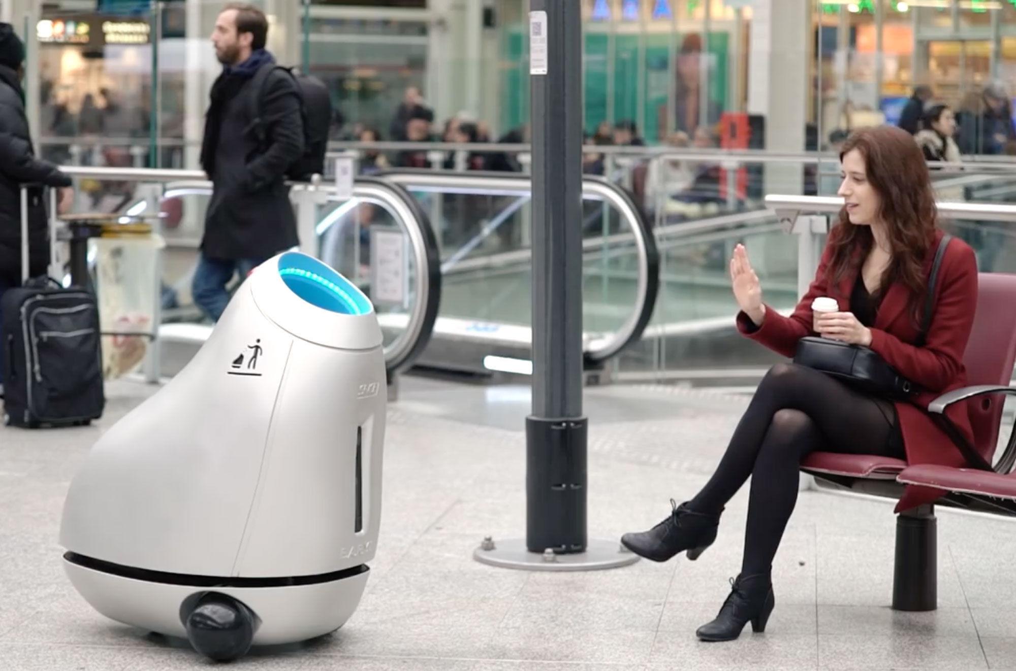 Этот робот ездит по вокзалу и обращаясь к людям предлагает им выбросить мусор. В урне, которую несет робот, имеется датчик наполняемости. Когда робот получает сигнал о полной урне, то едет к обслуживающему персоналу.