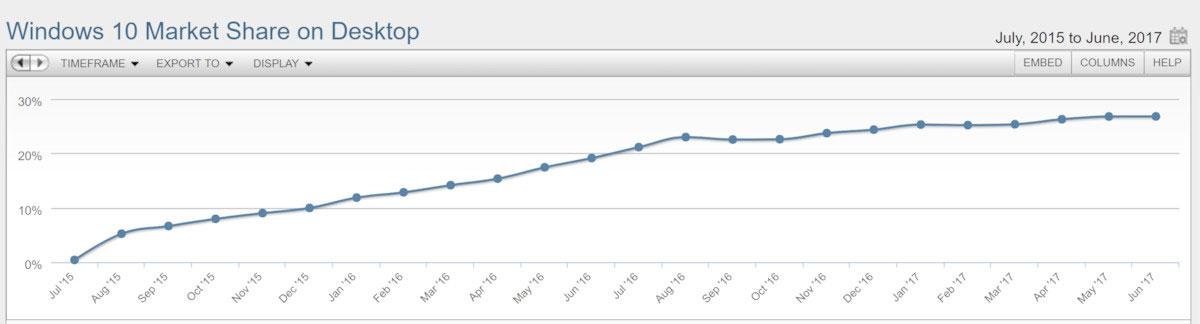 В июне 2017 года Windows 10 была установлена на 26,8% десктопов и ноутбуков в глобальном масштабе против 26,78% месяцем ранее, сообщает Dailycomm. Самой популярной программной платформой все еще остается Windows 7, доля которой за месяц снизилась с 49,46% до 49,04%. Тройку лидеров снова замыкает Windows XP, которая по итогам первого летнего месяца опередила Windows 8.1 (показатели присутствия этих ОС составили 6,94% и 6,4% соответственно). NetMarketShare берет в рассмотрение данные 160 млн пользователей по всему миру, просматривающих более 40 000 веб-сайтов.