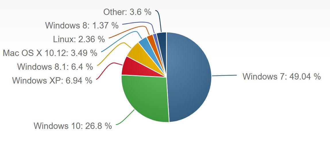 По данным сервиса StatCounter, учитывающего более 15 млрд просмотров веб-страниц на 3 млн сайтах, в июне 2017 года Windows заняла почти 84,3% рынка против 11,6% у macOS и 1,74% у Linux.
