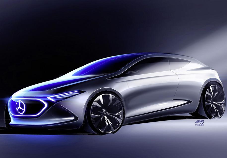 Из скетча концепта Mercedes EQ A видно, что модель представляет собой компактный двухдверный хэтчбек с весьма выразительным дизайном.