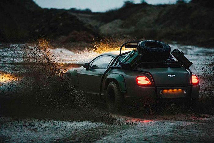 У этого несколько странного автомобиля Bentley увеличенный дорожный просвет и колёса с широченными шинами на 17-дюймовых стальных дисках. Специально для этих колёс установили расширители колёсных арок. На крыше красуются багажник и дополнительные фары.