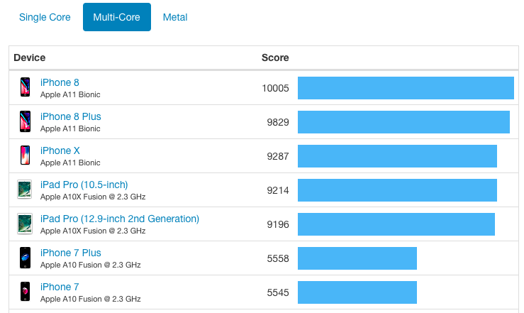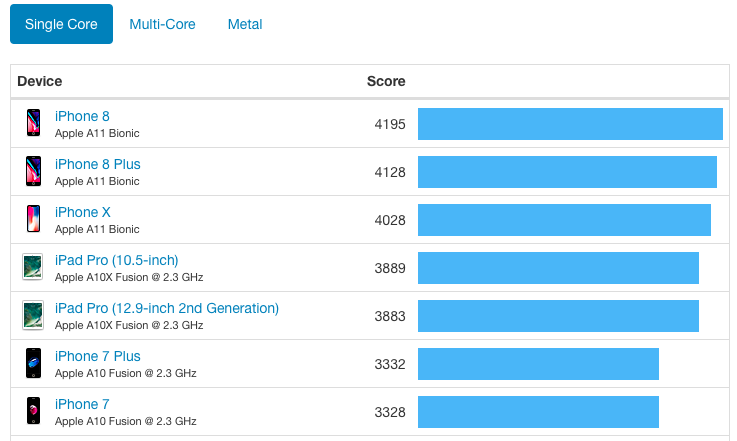 Результат iPhone 8 под управлением процессора A11 Bionic составил 4195 и 10005, тогда как iPhone 8 Plus показал 4128 и 9829, а iPhone X — 4028 и 9287 в тесте одного и нескольких ядер соответственно.