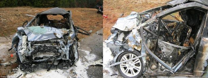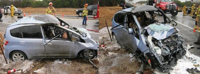 Миниатюрная Honda Fit 2010 года выпуска супругов после попадания в ДТП получила серьезные повреждения и загорелась в результате разрыва топливного бака. Как можно видеть на снимках, машину буквально расплющило. Сами владельцы выжили чудом, хотя и получили ожоги разной степени тяжести, поскольку некоторое время были заперты в огненной ловушке.