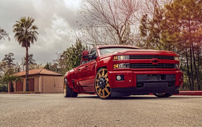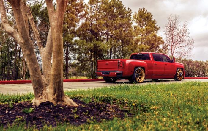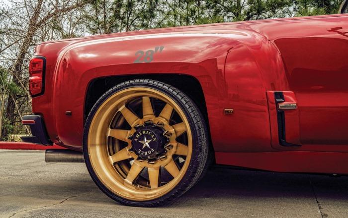 Главной особенностью работы American Force является создание кованных колесных дисков. Именно такие и были установлены на пикапе. Очень необычные колеса сзади: модель сдвоенных кованых дисков с 28-дюймами в диаметре. Покрасили диски с броский золотистый оттенок. То, что получилось в итоге, было не похоже не на один другой автомобиль, созданный для мероприятия.