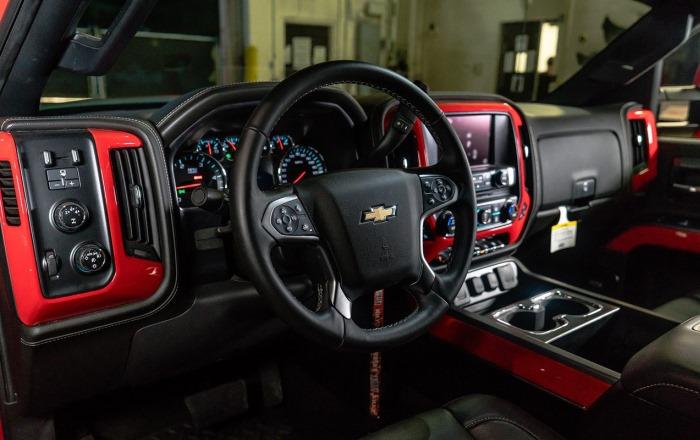 Среди других важных изменений в пикапе для шоу следует отметить установку карбонового капота уникальной формы и расцветки. По бокам были установлены крутые воздуховоды, они расположились на задних крыльях перед колесами. Над верхним стеклом появился ветровик. Все это тюнинговое счастье покрасили в цвета кузова автомобиля – черный и красный.
