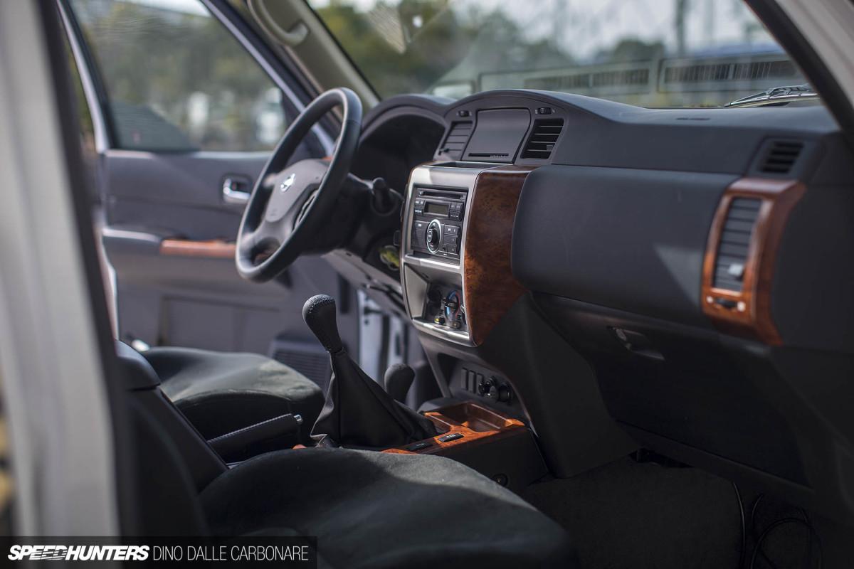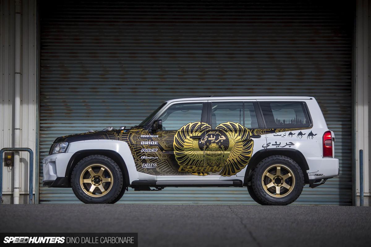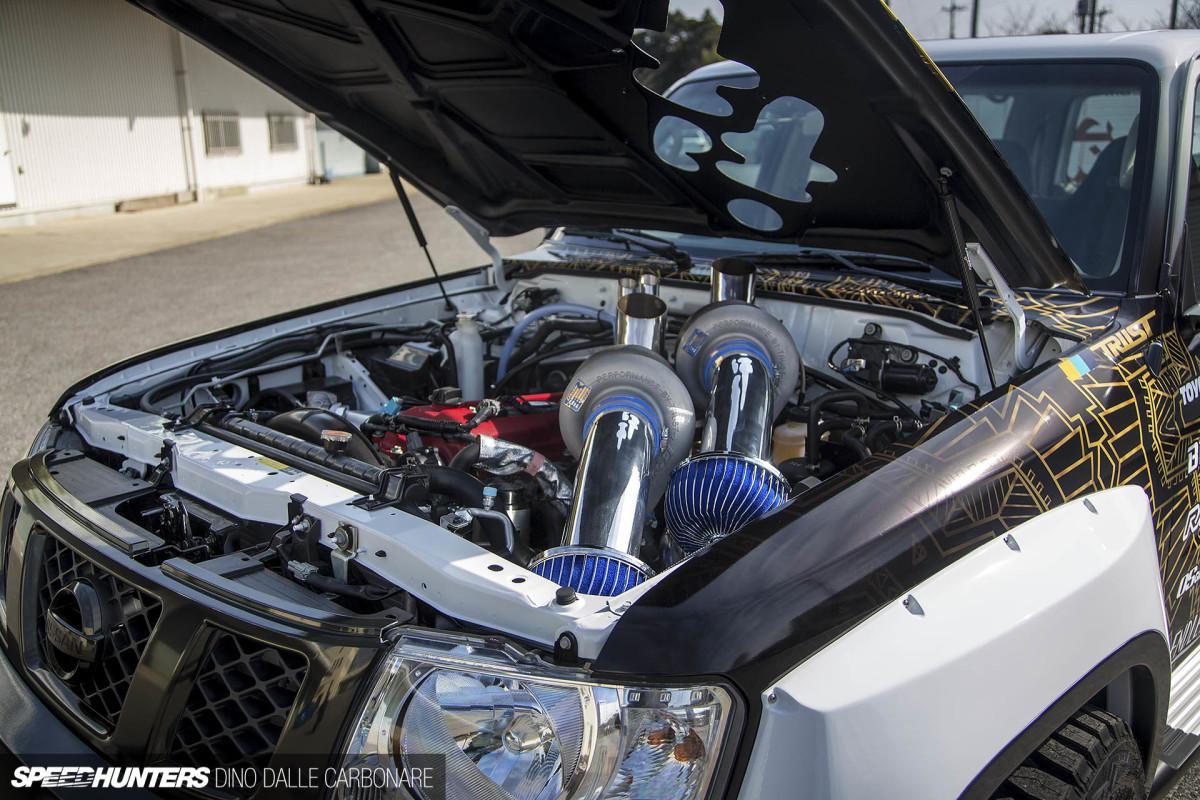 Главное достоинство прокачанного Nissan Patrol прячется под капотом. Двигатель Nissan TB48DE дополнен двумя огромными турбонагнетателями с давлением наддува 2,5 бара и рядом деталей от Nissan GT-R. Установлена и особая выхлопная система с трубами, торчащими прямо из капота.