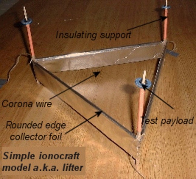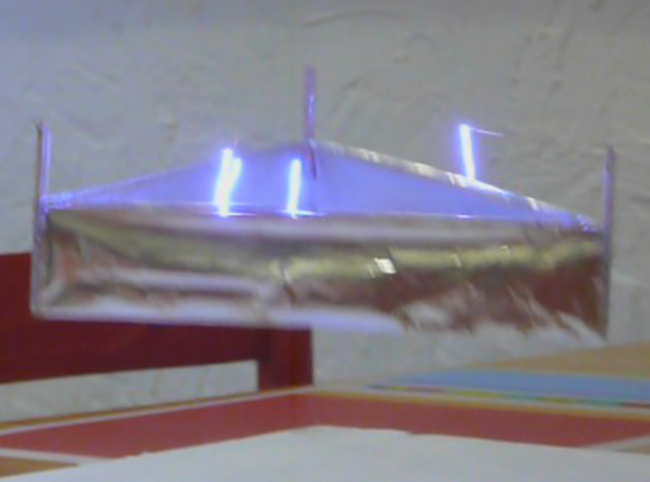 В рабочей модели такого «ионолета», созданного командой лаборатории MIT, анод из тонкого медного электрода называют «эмиттером». А катод, в роли которого здесь используется алюминиевая трубка, называют «коллектором». Затем их соединяют с помощью очень тонкой рамки, подключают эту конструкцию к внешнему источнику питания, и конструкция взлетает. Что интересно, при изменении напряжения таким «ионолетом» можно даже управлять, развернув его, как разворачивается вертолет. При этом он не создает никакого шума. Он как бы парит.