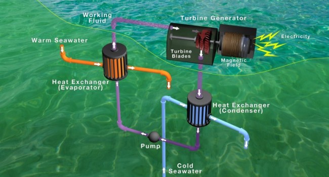 Для производства электроэнергии OTEC-станция использует естественную разницу температур холодной воды на глубинных океанических участках и теплых поверхностных вод. Принцип следующий: проходя через теплообменник, теплая морская вода превращает в пар жидкость с низкой температурой кипения, например, аммиак. Пар приводит в движение электрогенерирующую турбину. Холодная вода, в свою очередь, переводит пар в жидкость и цикл повторяется.