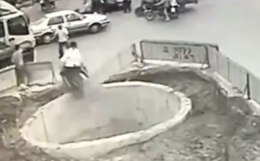 В Китае, водитель мопеда не проехав и ста метров, попал в несколько аварий, после чего свалился в яму.