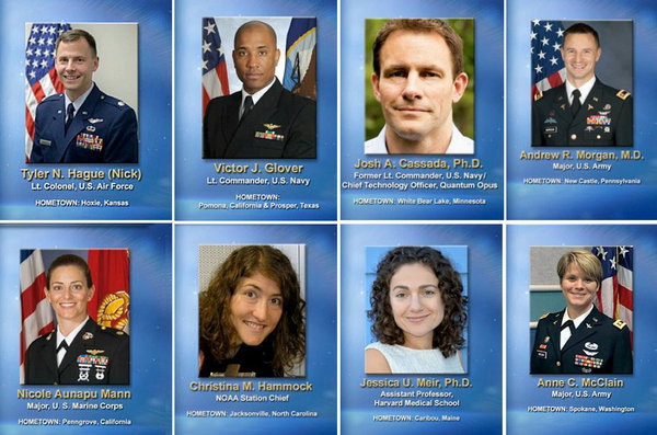В космонавты берут только лучших. Двое из соискателей являются кандидатами наук, а один работает врачом спортивной медицины. Четверо — опытные летчики-испытатели военных сил США. Один человек работает в Пентагоне в направлении обезвреживания самодельных взрывных устройств, а другой занимается океаническими и атмосферными исследованиями.