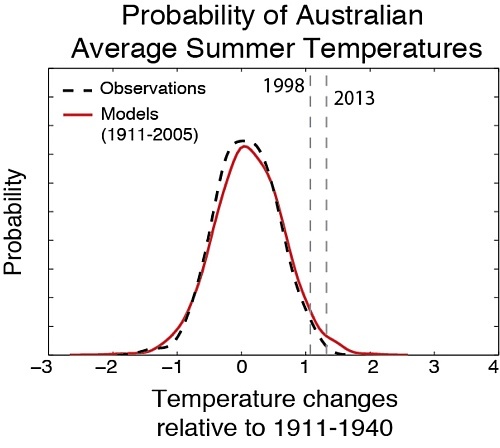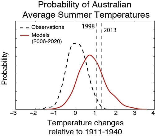 Поначалу в исследовании было задействовано более 20 климатических моделей последнего поколения, которые участвуют в международном эксперименте по выработке стандартов для расчётов такого рода. Из них только девять смогли воспроизвести наблюдаемые вариации. На них и основывался анализ изменения вероятности экстремальных температур грядущим австралийским летом из-за влияния человека.