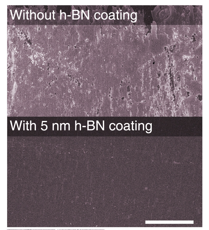 На изображении выше: поверхность без покрытия нитрида бора и с ним