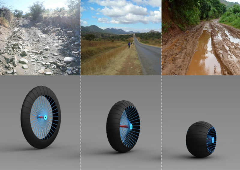 Концепт колеса Roadless, способного менять свою форму и подстраиваться под любой тип дороги, предложил Аким Нгвенья (Ackeem Ngwenya), студент Королевского колледжа искусств в Лондоне.