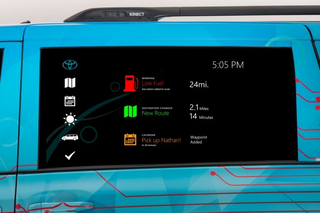 DAR-V (Driver Awareness Research Vehicle), собранная на базе минивэна Sienna, использует новейшую интерактивную систему, которая помогает водителю сосредоточиться на важных делах до того, как он сядет за руль. Датчик Kinect автоматически распознает приближающегося к автомобилю пользователя, чтобы вывести на боковое стекло персонифицированную информацию. Это может быть информация о погоде, дорожных условиях, запланированных встречах и состоянии автомобиля. Управление системой осуществляется с помощью голоса, жестов или брелока для ключей, пишет журнал Automotive Business Review.