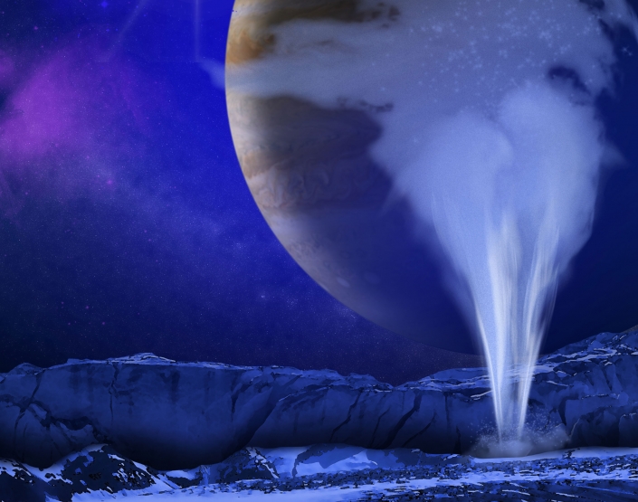 Ученые впоследствии выяснили, что это свечение было следствием столкновения выбрасываемых с поверхности Европы молекул воды о магнитное поле Юпитера. Исследователи считают, что трещины на поверхности Европы играют своего рода роль вентиляционных отверстий для отвода водяного пара. Такая же «система» была обнаружена и на Энцеладе, спутнике Сатурна. Кроме того, как показывают данные с телескопа, выброс воды останавливается в тот момент, когда Европа находится в самой близкой своей точке к Юпитеру. Астрономы считают, что это скорее всего связано с гравитационным воздействием планеты, которое создает своеобразную затычку для трещин на спутнике.