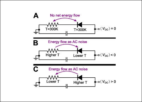 Как только температура с обеих сторон устройства перестаёт быть равной (B, C), по цепи начинает течь ток. (Иллюстрация F. Capasso et al.)