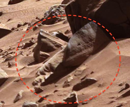 А ныне увидел марсианина. Не живого, конечно, а в виде скульптуры. На снимке, который в феврале 2014 года передал на Землю робот "Любопытство" "(Mars Science Laboratory Curiosity), можно разглядеть половину головы, высеченной из камня. К роботу она - голова - обращена лицом.