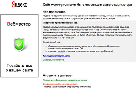 «Сайт www.rg.ru может быть опасен для вашего компьютера. «Яндекс» обнаружил на этом сайте вредоносный программный код, который может заразить ваш компьютер вирусом или получить доступ к вашей личной информации», — говорится в тексте предупреждения об угрозе. Исходя из сообщения, код может быть опасен как для персональных компьютеров, так и для мобильных устройств.