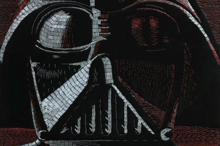 Только задумайтесь: для портрета Дарта Вейдера художнику потребовалось 10 496 скоб: 7 696 серебристых и 2 800 красных. Размер картины составляет 80 на 100 сантиметров. Помимо Вейдера, художник изобразил также портреты болтливого робота C3PO и охотника за головами Гридо.