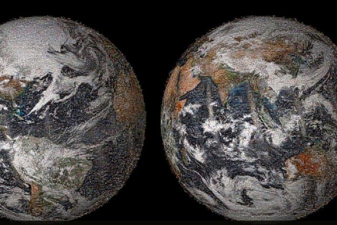 Из всех этих фотографий, уменьшенных до размеров пикселей, и создали карту двух полушарий Земли. У карты есть секрет – если увеличить полушария, они медленно превращаются в селфи землян.