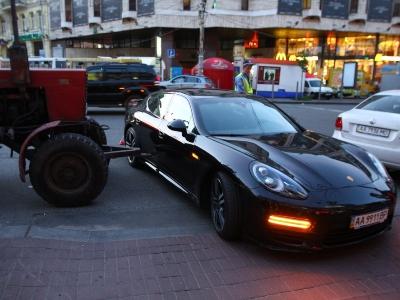 24 мая, около 20.00 на Площади Льва Толстого в Киеве произошла необычная авария. Трактор "Беларусь" пробил передним фаркопом задние дверцы легкового автомобиля Porsche Panamera с депутатскими номерами.