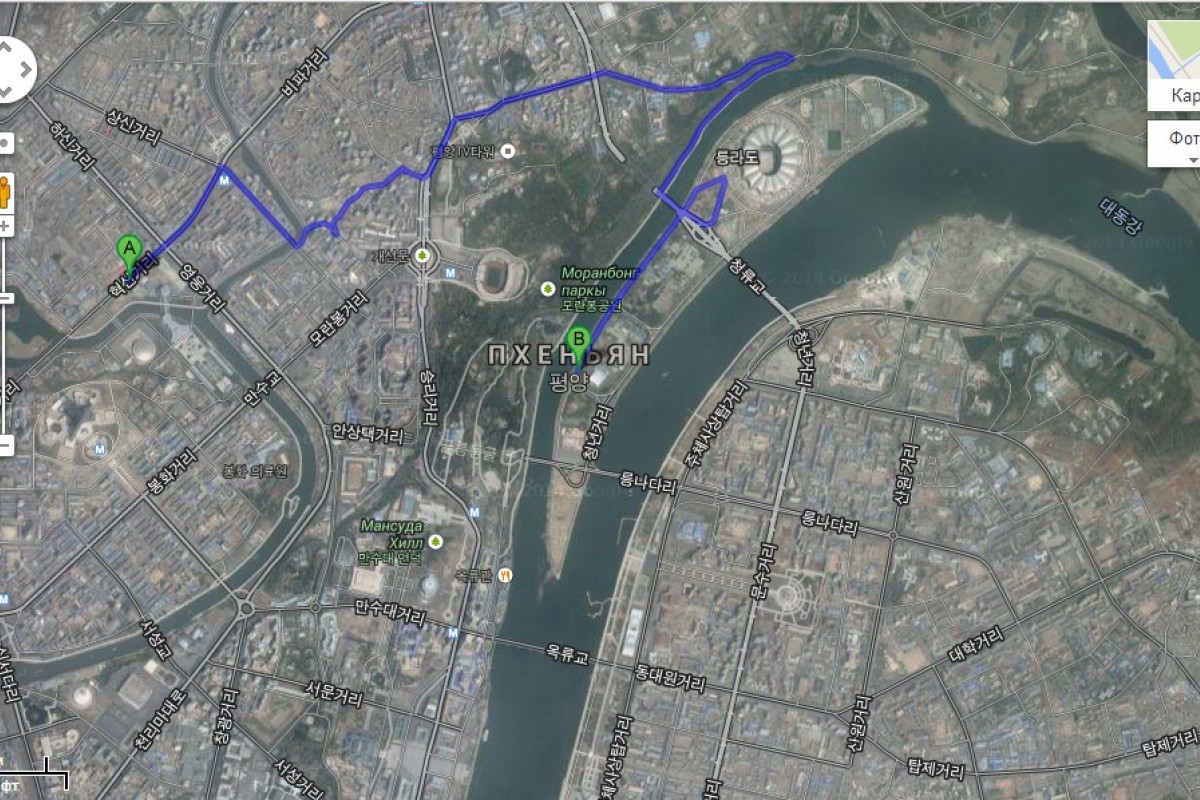 Теперь же Google сделал еще один важный шаг, добавив к картам указания маршрутов для автомобилей и пешеходов. С их помощью, например, можно вычислить время, необходимое для поездки со скоростью 105 км/ч. Правда, оценка эта чересчур оптимистична, поскольку максимально разрешенная скорость на северокорейских дорогах составляет 70 км/ч.