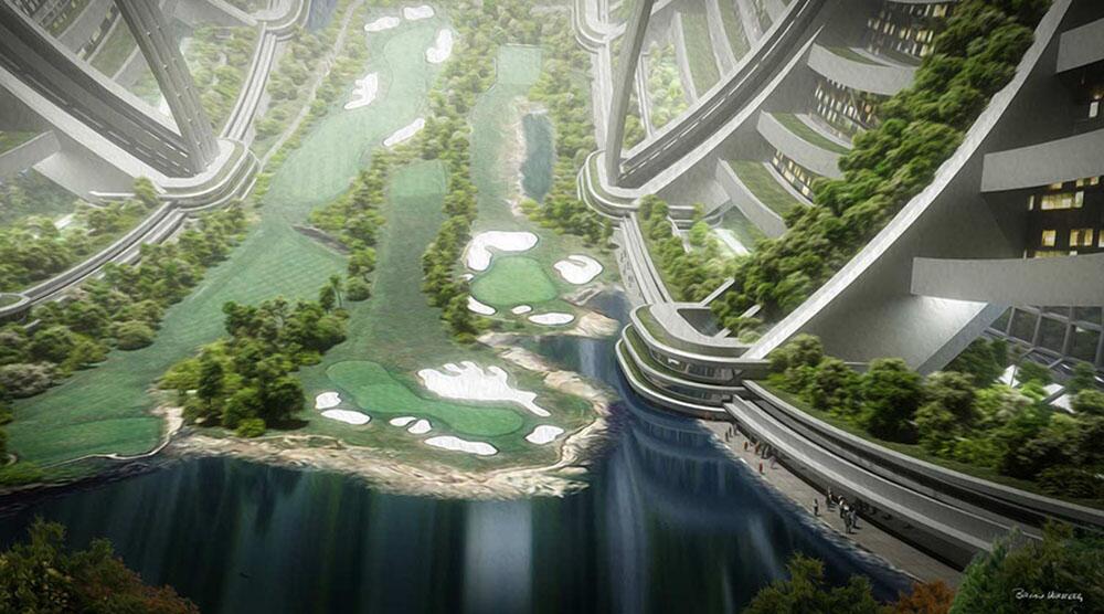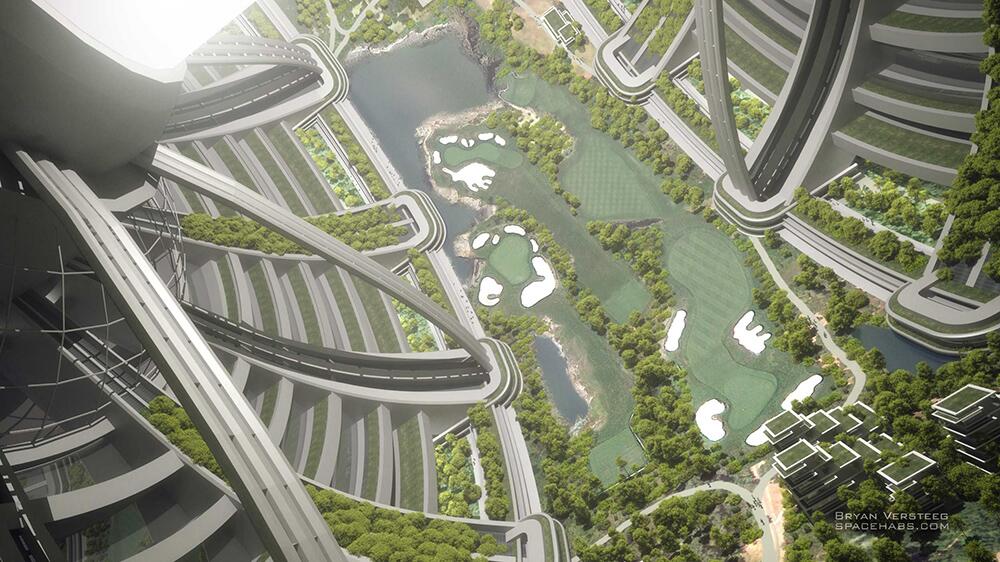 «С тем же радиусом 250 метров и глубиной в 325 метров, станция будет совершать два полных оборота вокруг себя в минуту и создавать ощущение того, что человек, находясь в ней, будет испытывать то чувство, как если бы он находился в условиях земной гравитации. А это очень важный аспект, так как гравитация позволит нам жить дольше в условиях космоса, ведь наши кости и мускулы будут развиваться так же, как они развивались бы на Земле. Так как подобные станции в будущем могут стать постоянным местом обитания для людей, то очень важно создать на них условия, максимально близкие к условиям на нашей планете. Сделать так, чтобы люди могли на ней не только работать, но и отдыхать. И отдыхать с изысками».