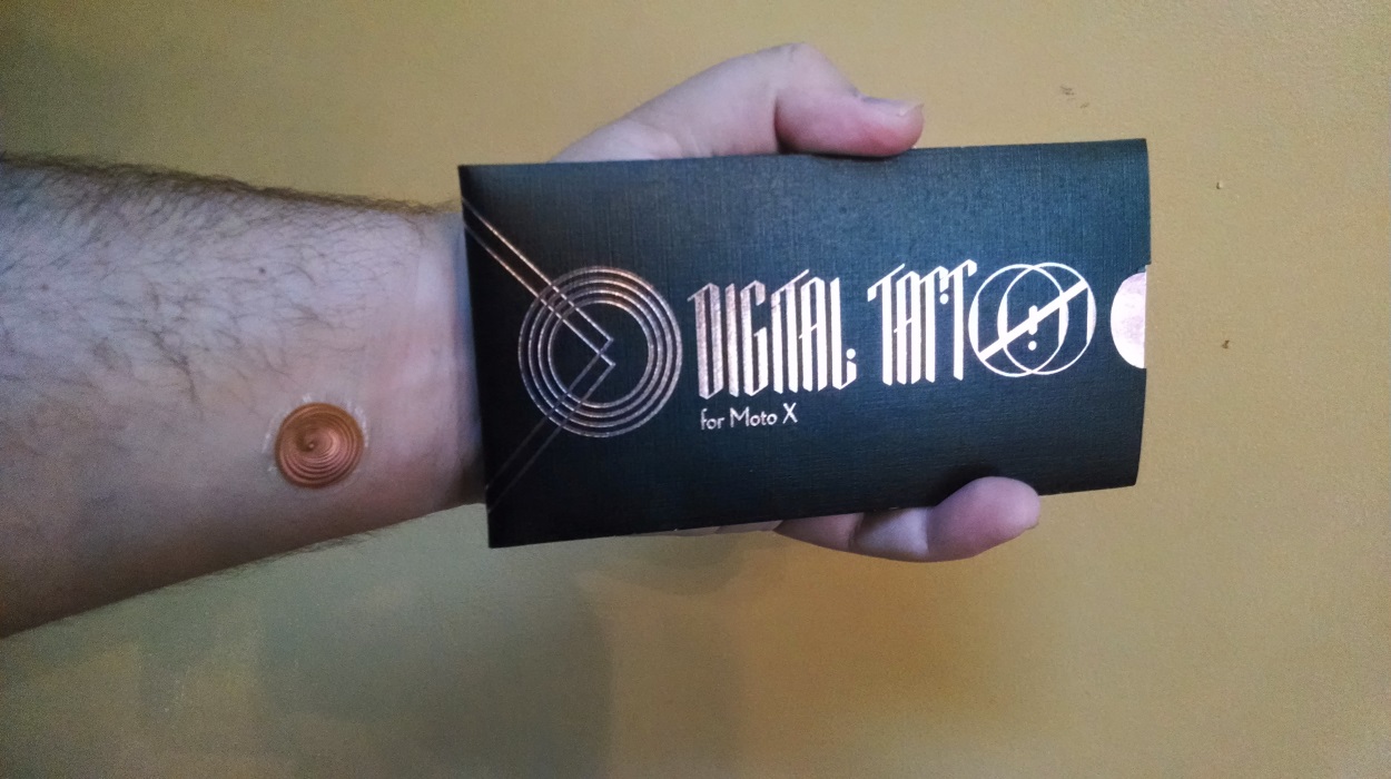 Компания VivaLnk разработала «цифровую татуировку» для Motorola Moto X, которая может использоваться для доступа к мобильному телефону владельца. Татуировка клеится на запястье человека и держится около пяти дней, при этом позволяя спокойно принимать с ней водные процедуры. Татуировка представляет собой изготовленные из меди небольшие микросхемы диаметром 25 миллиметров и толщиной 160 микрометров. Стоимость каждой упаковки из 10 наклеек составляет 9, 99 долларов.