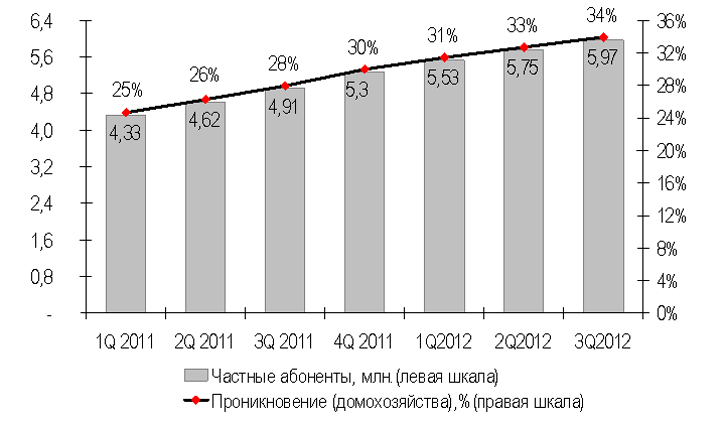 По данным аналитиков компании, на 30 сентября 2012 года общее количество абонентов широкополосного доступа (частных и корпоративных) составило 6,7 млн, из которых 5,97 млн – домашние пользователи (домохозяйства). Объем доходов провайдеров ШПД по результатам III квартала оценен в 1,366 млрд. грн. (без НДС) – рост по сравнению с предыдущим отчетным периодом составил 1,2%. По сравнению с аналогичным периодом прошлого года объем доходов увеличился на 13,7%.