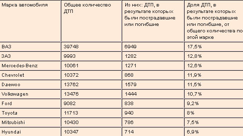 На второй позиции рейтинга — ЗАЗ с его народными “Ланосами”. За январь-ноябрь 2012-го — 9 тыс. 993 ДТП, из которых 1 тыс. 282 шт. — повлекли за собой телесные повреждения разной степени тяжести либо смерть людей. В процентах — это 12,8% всех ДТП с машинами марки ЗАЗ. Третье и четвертое места заняли Mercedes-Benz (10 тыс. 61 ДТП из которых 1 тыс. 271 с кровавими последствиями; 12,6%) и Chevrolet (10 тыс. 372 / 868 ДТП; 11,9%).