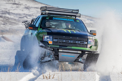 Американский профессиональный гонщик Кен Блок покоряет горные гряды на Ford RaptorTRAX с траками для снега.