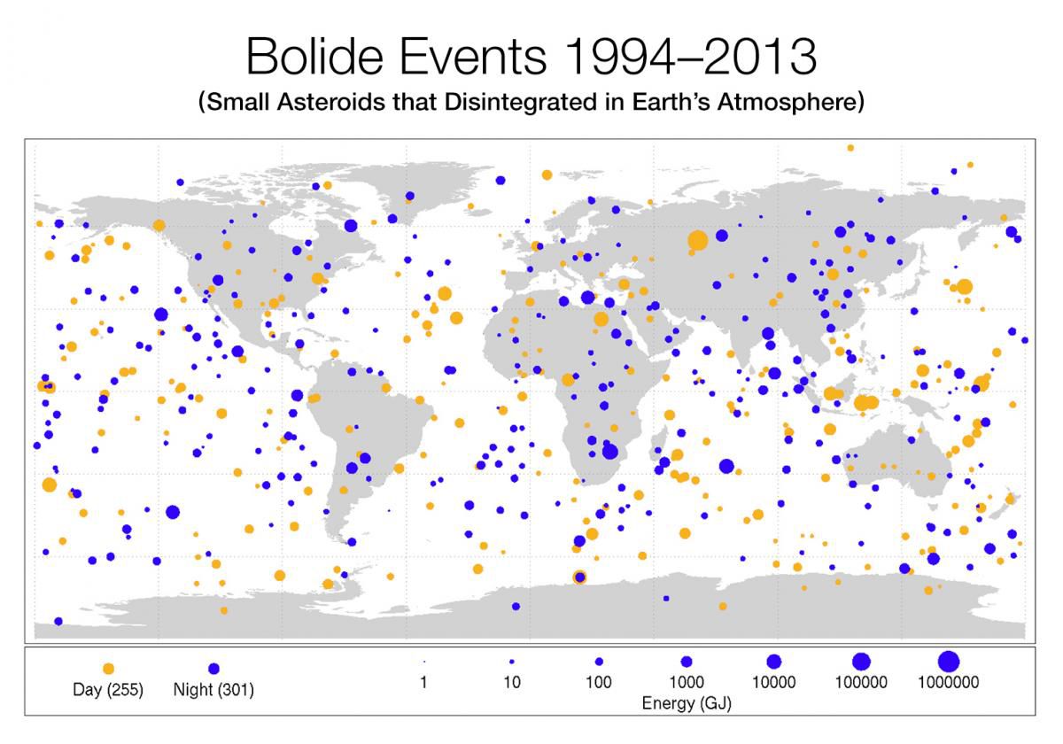 В рамках программы «Околоземный объект», проводимой NASA , составлена карта, показывающая, что входящие в атмосферу Земли небольшие астероиды ею разрушаются со случайным распределением по всему миру. Этой картой визуализируются данные, собранные за 1994-2013 годы датчиками США.