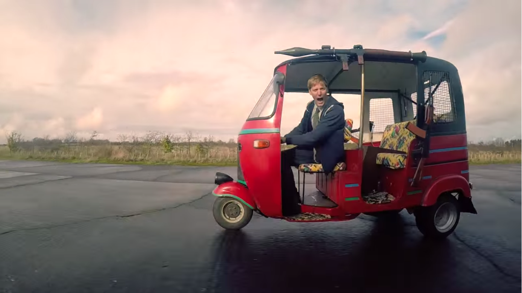 Маломощный двигатель красного «тук-тука» отправился на помойку, а его место занял 100-сильный мотор от спортбайка Honda CBR 600. Кроме десятикратного прироста мощности, моторикша получила два гранатомета на крыше, два пистолета-пулемета Uzi спереди, два АК-47 по бокам и пару огнеметов сзади.