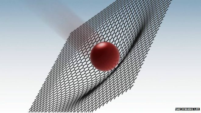 Наблюдения с помощью электронного микроскопа показали, что графен рассеивает энергию удара, вытягиваясь в форму конуса, в котором затем образуются трещины.