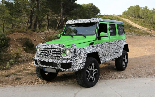 Четырехколесный Mercedes-Benz G 63 AMG 6x6 станет серийной моделью. Фотошпионы сфотографировали его четырехколесную модификацию в камуфляже на европейских дорогах. Инсайдеры автомобильного концерна заявляют, что новинка пойдет в серию уже в 2015 году.