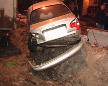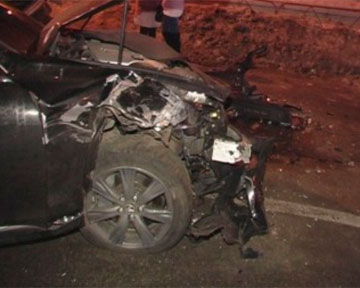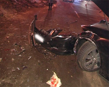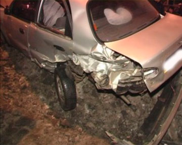 От удара "Лексус" отбросило в сторону тротуара и он врезался в припаркованный "Ланос".