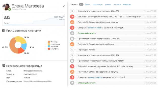 Нужны подробности отдельно по каждому человеку? Convead умеет и это. Сервис даёт полную информацию о любом посетителе: сколько раз он заходил на сайт, какие товары смотрел, что купил и на какую сумму, что оставил в корзине… А на диаграмме сразу видно, какие категории товаров ему интересны. Все эти данные хранятся в карточке пользователя. Здесь даже можно посмотреть видео со всеми его действиями за последние 10 дней.