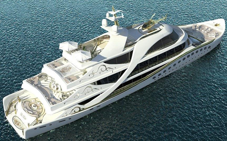Дизайн яхты просто завораживает: длина в 80 м, оформлена кристаллами Swarovski, золотом, мехом и цветами, присутствуют белые, кремовые и золотые тона.