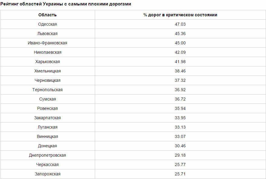 В рамках сервиса navizor.com пользователи могли оставить мнение по качеству дорог в разных областях страны. Подведя итоги, стало ясно, что сложнее всего передвигаться по Одесской, Львовской и Ивано-Франковской областям (данные регионы собрали "урожай" нелестных отзывов на уровне 45% и выше), а легче – по Киевской и Кировоградской (менее 15%).