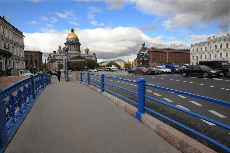 Ширина этого моста составляет 97,3 м. Построен он был 1818 году, правда, первоначально, его ширина была значительно меньше – 41 м. Сегодняшние размеры Синий мост приобрел после расширения в 1842-1844 годах, связанных с постройкой Мариинского дворца и перепланировкой Исаакиевской площади.