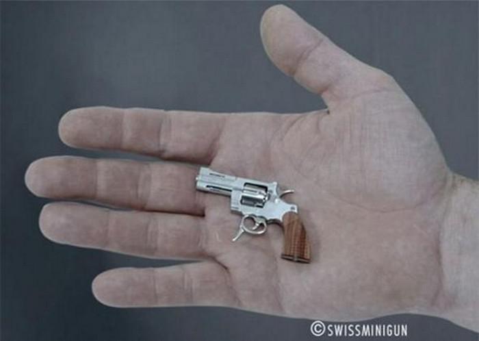 Длина этого швейцарского чуда составляет всего 5 с половиной сантиметра, а диаметр пуль — 2,34 мм. Тем не менее, скорость полета его пули равна почти 120 км в час, а дальность стрельбы составляет 112 метров.