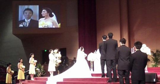 Около 500 гостей стали свидетелями необычного бракосочетания. В костеле над алтарем установили огромный экран монитора, а съемку торжества вели пятеро видеоператоров. У самого Кима в больничной палате был маленький ноутбук, зато с большого экрана в церкви всем гостям было видно и слышно, как он дает обет любви и верности.