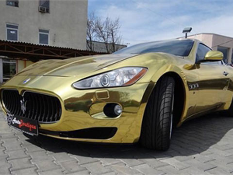 Понятно, что Мазератти не сделан из драгоценного металла, хотя его и называют золотым. Прозвище автомобилю дали из-за специальной пленки, которой обтянули его корпус. По цвету она золотая. Но вид такого тюнинга очень дорогой и очень сложный.