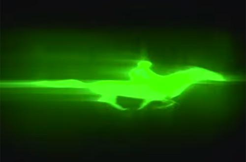 Проецируемые на небо лошадь с наездником были отчетливо видны с расстояния в 50 метров.Стоит отметить, что первый прототип Project Nimbus был создан художником еще в 2007 году на основе изобретенного в 1879 году Эвдардом Мейбриджем зоопраксископа.
