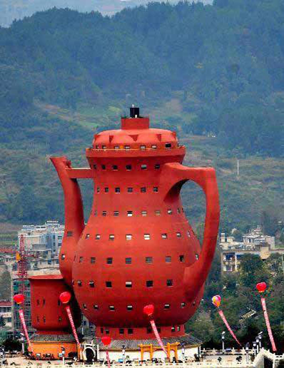 Посещение музея решили увеличить, сделав его в виде уникального архитектурного памятника. Гигантский чайник из глины, рядом с которым расположилось здание поменьше, в виде чашки для чая.