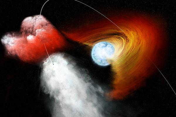 Данные обсерватории NASA Chandra X-ray свидетельствуют о том, что сгусток звездного материала был выброшен из системы двойной звезды на невероятно высоких скоростях. Исследователи считают, что объем этой материи более, чем в 100 раз больше размера Солнечной системы. Выброс случился, когда пульсар столкнулся с диском вокруг массивной звезды во время путешествия по своей эллиптической орбите.
