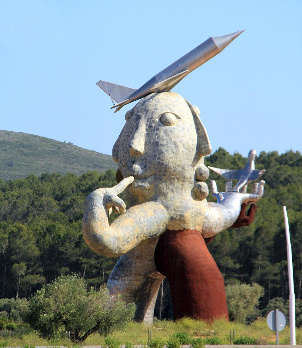 Странные яркие «человечки» Рипойеса стоят, лежат или проделывают непонятные трюки в разных городах и весях провинции — от Кастельона-де-ла-Плана до Оропесы-дель-Мар. Одна из самых спорных работ Рипойеса одиноко стоит у здания пустующего аэропорта Кастельона. «Человек-самолет» — так называется 20-метровое антропоморфное четырехликое изваяние, олицетворяющее тот самый испанский кризис. Из двух рук гигант выпускает железную птицу, на третьей руке сосет палец. The New York Times назвала статую «символом разорения в аэропорту без судьбы»…