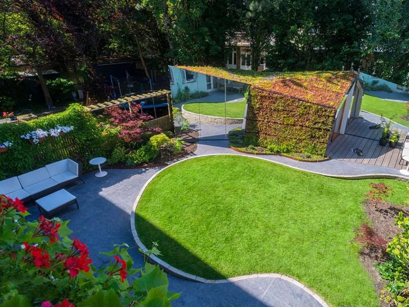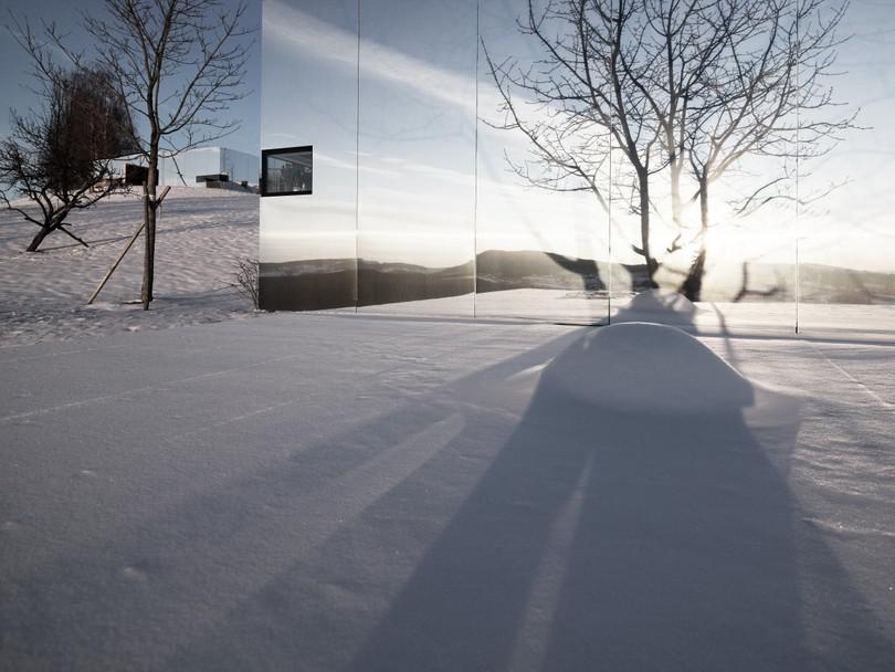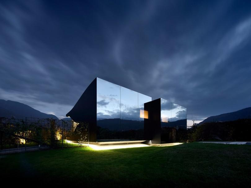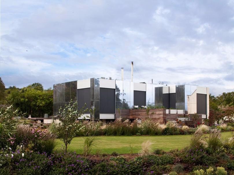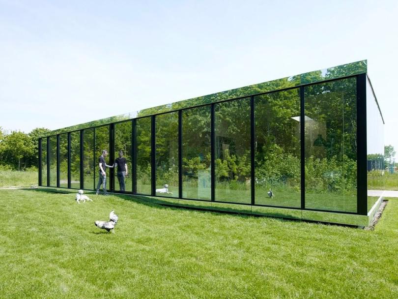 Обычно, в постройке используют фасадную штукатурку и кирпичную кладку заменяют зеркальные поверхности.