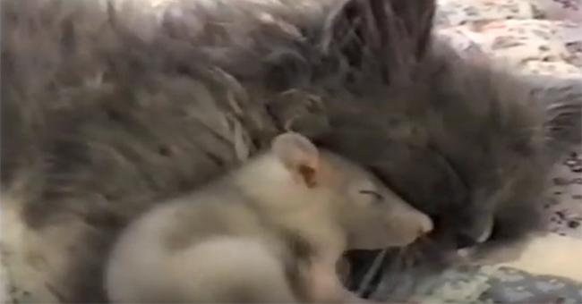 Сначала эта мышка бесстрашно обнюхивает своего потенциального врага, потом придвигается к нему поближе… В конце концов она сворачивается в клубочек и укладывается спать рядом со спящим котёнком.